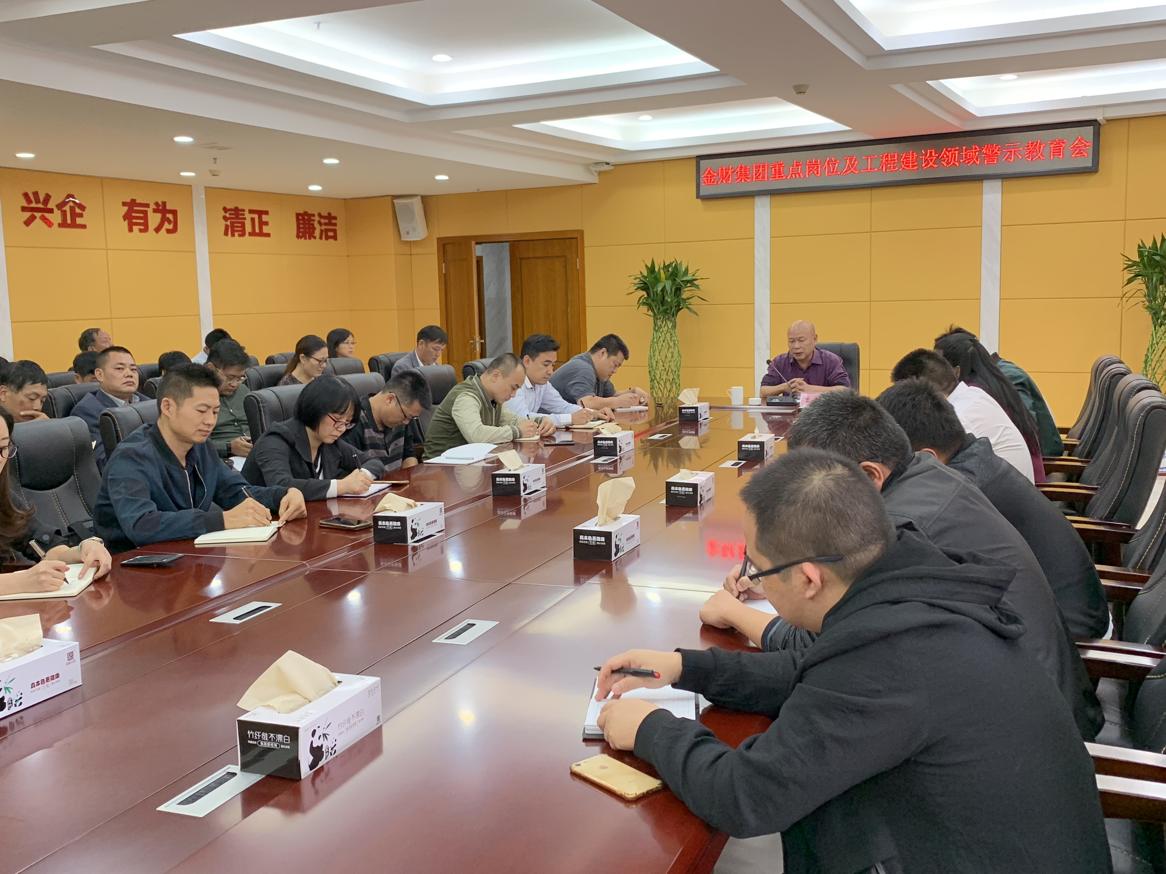 11月13日下午,金財(cái)投資集團(tuán)黨委組織召開重點(diǎn)崗位人員及工程建設(shè)領(lǐng)域警示教育會(huì)議,由金財(cái)集團(tuán)公司黨委委員、紀(jì)委書記曾梅主持會(huì)議,公司各部門、各子公司重點(diǎn)崗位人員及工程項(xiàng)目主要負(fù)責(zé)人、參建單位項(xiàng)目負(fù)責(zé)人共42人參加會(huì)議。與會(huì)人員首先觀看了警示教育片《工程建設(shè)領(lǐng)域腐敗剖視錄》,然后由曾梅同志與參會(huì)人進(jìn)行集體談話。曾梅同志結(jié)合身邊的實(shí)例強(qiáng)調(diào)開展集體談話的重要性,開展廉政建設(shè)集體談話,既是落實(shí)“一崗雙責(zé)”的具體行動(dòng),也是壓實(shí)黨風(fēng)廉政建設(shè)責(zé)任的迫切要求。通過集體談話,可以進(jìn)一步增強(qiáng)廉潔自律意識(shí),提高干部隊(duì)伍拒腐防變能力,切實(shí)擔(dān)負(fù)起自身工作職責(zé),使大家都能嚴(yán)明紀(jì)律、嚴(yán)守規(guī)定、廉潔自律,全力做好集團(tuán)公司的各項(xiàng)工作,樹立黨員干部的良好形象。 曾梅同志對(duì)大家提出三點(diǎn)要求:一是要守規(guī)矩真落實(shí),抓好黨風(fēng)廉政建設(shè)。通過制度機(jī)制建設(shè)、強(qiáng)化監(jiān)督制約、推進(jìn)權(quán)力公開透明運(yùn)行等方式加強(qiáng)對(duì)高風(fēng)險(xiǎn)領(lǐng)域、重要管理事項(xiàng)、關(guān)鍵業(yè)務(wù)環(huán)節(jié)的廉潔風(fēng)險(xiǎn)防控,加大從源頭上防范廉潔風(fēng)險(xiǎn)的工作力度。二是要加強(qiáng)黨風(fēng)廉政宣傳教育,增強(qiáng)廉潔從政意識(shí)和拒腐防變能力。堅(jiān)持用身邊事教育身邊人,舉一反三、以案明紀(jì),讓黨員干部知敬畏、存戒懼、守底線。習(xí)慣在受監(jiān)督和約束的環(huán)境中工作生活。黨員領(lǐng)導(dǎo)干部要帶頭嚴(yán)格廉潔自律,嚴(yán)格家教家風(fēng),嚴(yán)格管理親屬和身邊工作人員。三是綜合運(yùn)用監(jiān)督執(zhí)紀(jì)“四種形態(tài)”。正確運(yùn)用監(jiān)督執(zhí)紀(jì)“四種形態(tài)”,抓早抓小、防防微杜漸。用足第一種形態(tài),對(duì)發(fā)現(xiàn)的苗頭性問題及時(shí)談話函詢、批評(píng)教育、組織處理;用好用準(zhǔn)第二、三種形態(tài),通過給予黨紀(jì)處分、作出職務(wù)調(diào)整,對(duì)違紀(jì)黨員干部進(jìn)行敲警鐘、治“病樹”;用好第四種形態(tài),對(duì)嚴(yán)重違紀(jì)涉嫌違法的堅(jiān)決移送司法機(jī)關(guān)依法處理。 最后,曾梅同志要求集團(tuán)公司全體干部職工和參建工作者們必須從思想上筑牢拒腐防變和抵御風(fēng)險(xiǎn)的堤壩,牢記身上的責(zé)任,以永遠(yuǎn)在路上的執(zhí)著,不斷將全面從嚴(yán)治黨引向深入,抓牢抓實(shí)各項(xiàng)工作,共同開創(chuàng)集團(tuán)公司發(fā)展的新局面。