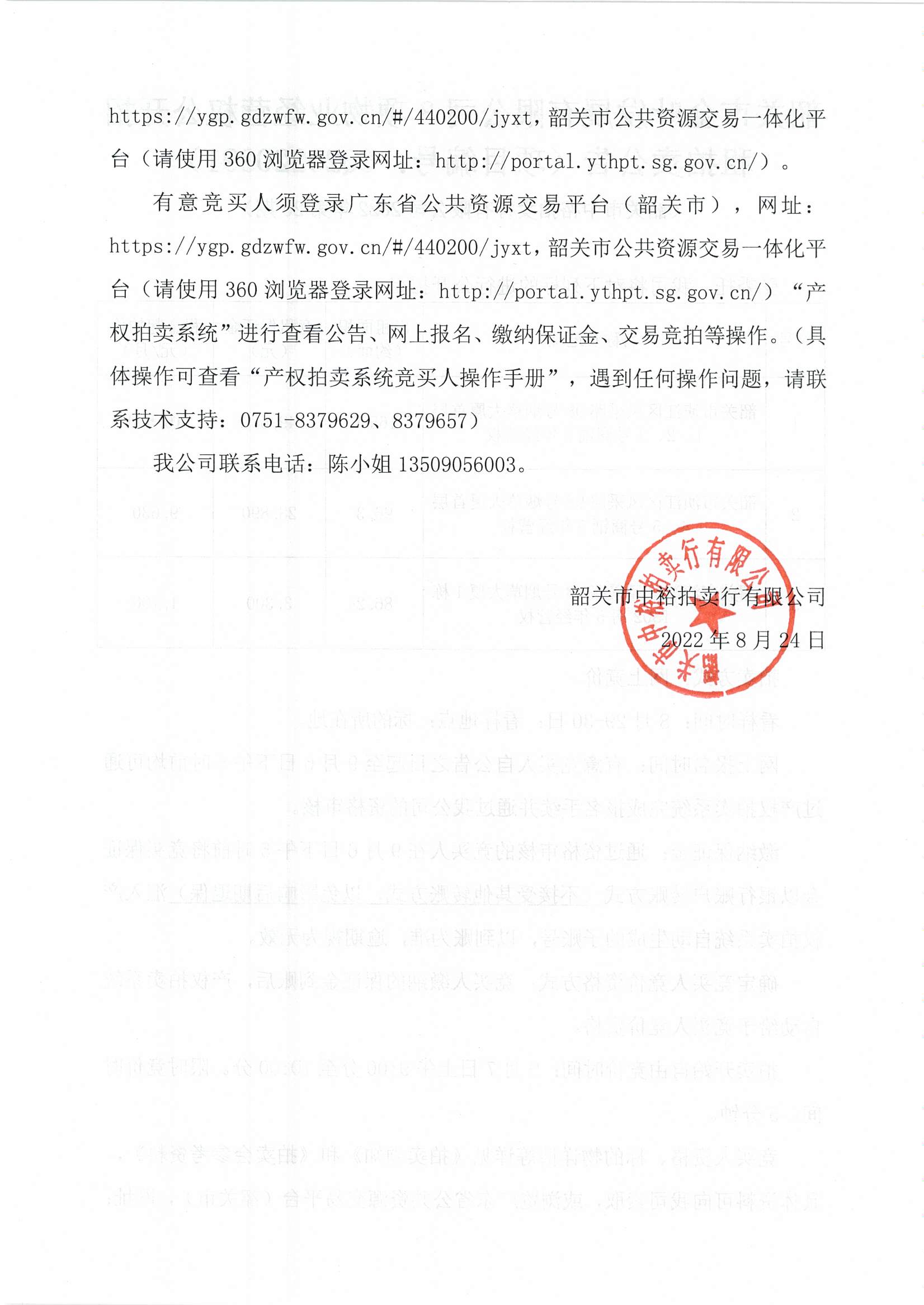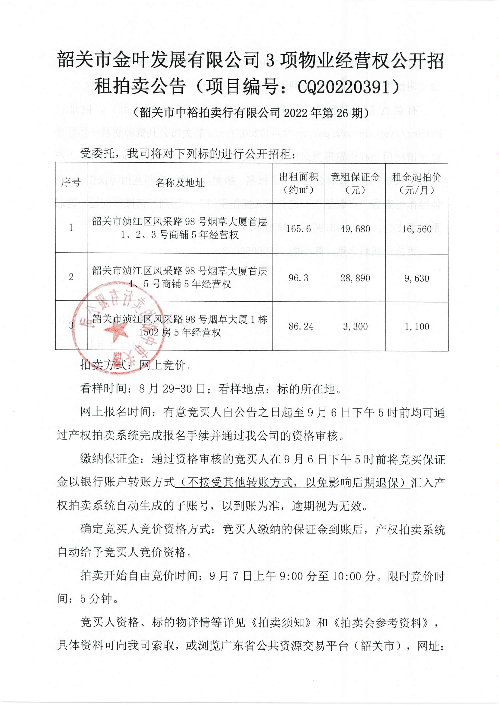 韶關(guān)市金葉發(fā)展有限公司3項(xiàng)物業(yè)經(jīng)營(yíng)權(quán)公開招租拍賣公告(項(xiàng)目編號(hào):CQ20220391)發(fā)布時(shí)間:2022-08-25 | 作者: | 點(diǎn)擊:0次